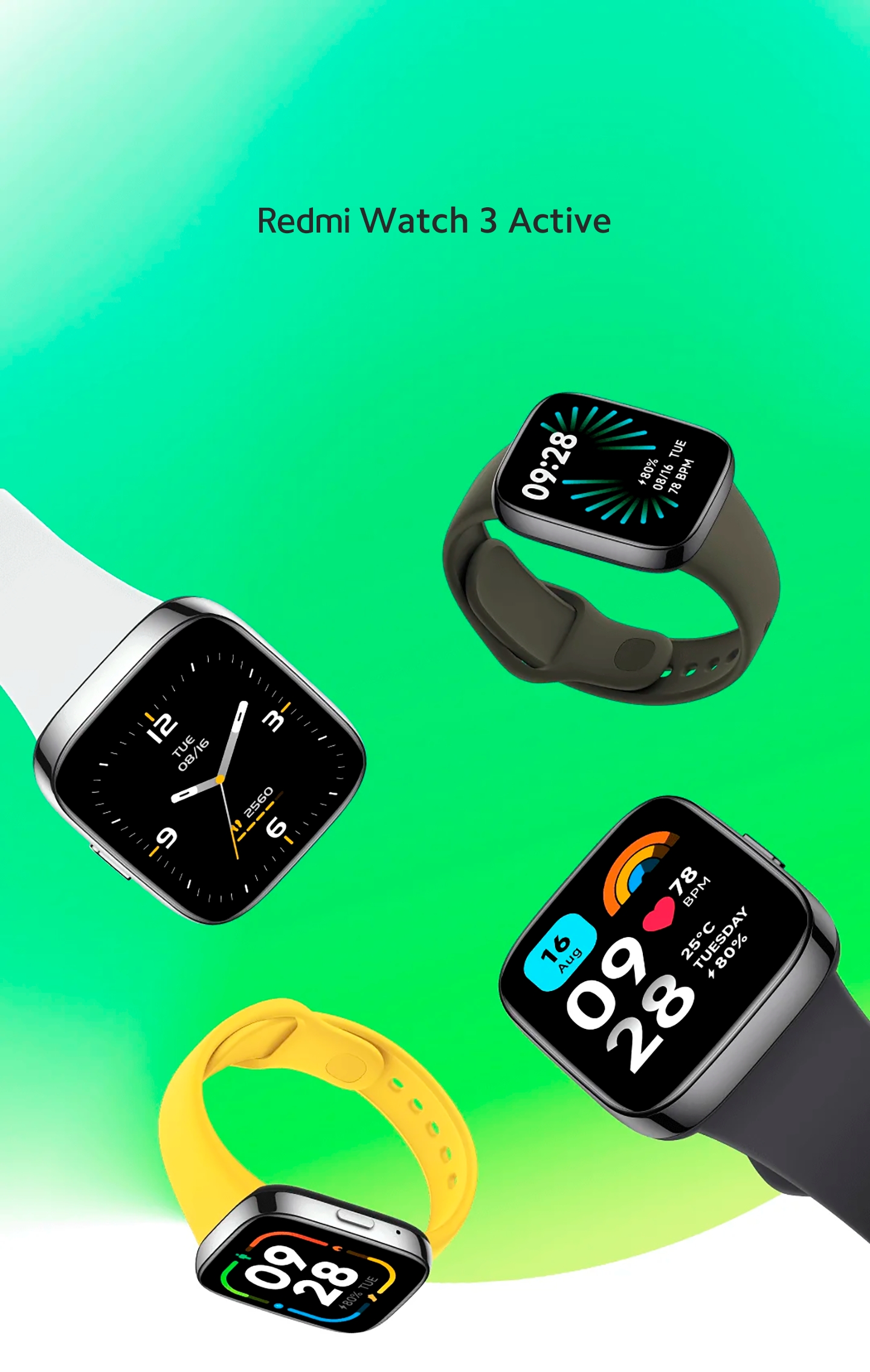 *O Redmi Watch 3 Active vem com pulseira preta/cinza; as pulseiras de outras cores devem ser adquiridas separadamente. As opções de cores podem variar dependendo da disponibilidade de estoque.