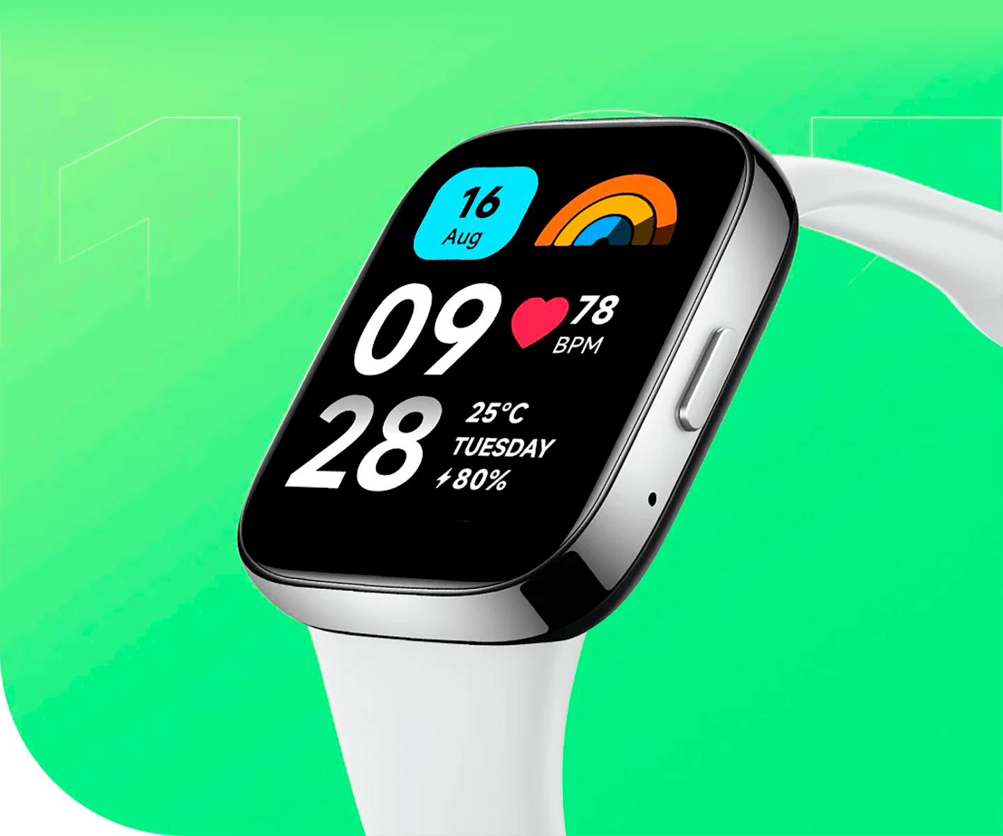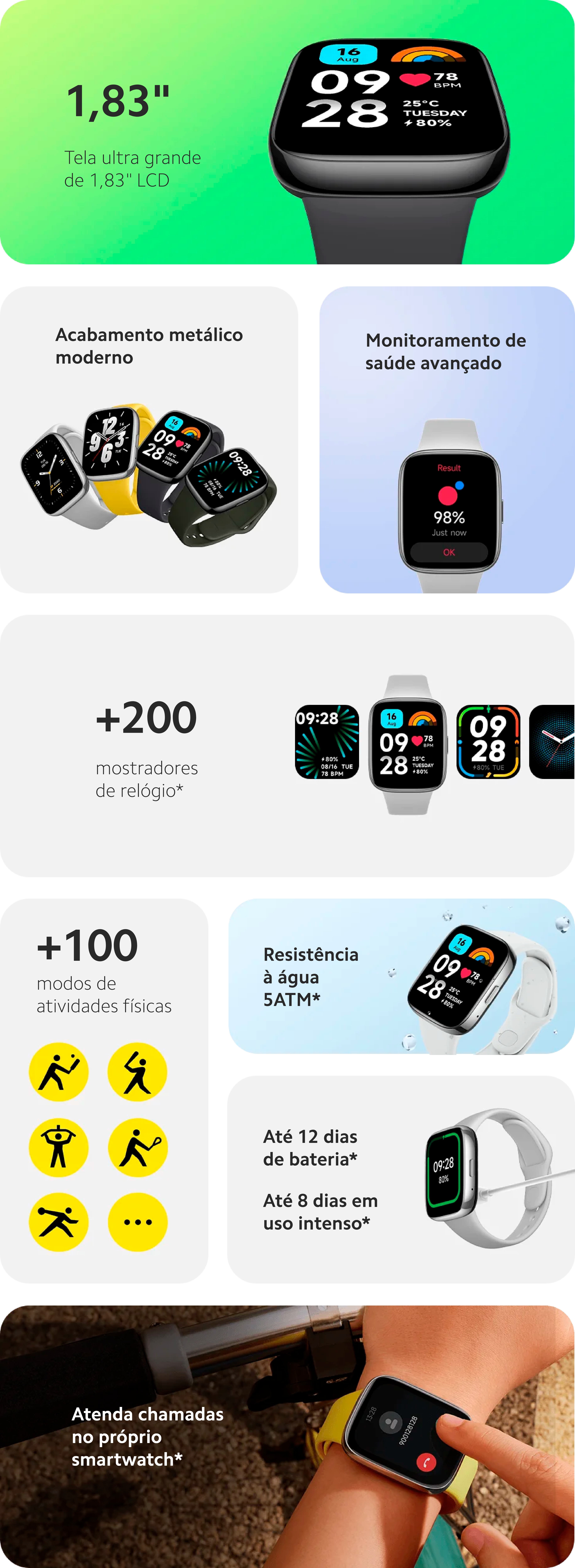 *Condições de teste de 12 dias do modo de uso pico para o Redmi Watch 3 Active: Carga completa, configuração padrão de fábrica, monitoramento de frequência cardíaca a cada 10 minutos, monitoramento de sono de alta precisão desativado, recebimento e exibição de 100 mensagens de notificação por dia, configuração de 3 alarmes por dia, levantar o pulso para acender a tela 200 vezes por dia, recebimento de 2 notificação de chamadas por dia, 15 minutos de chamadas Bluetooth por semana, 90 minutos de exercícios por semana e todas as outras configurações padrão.