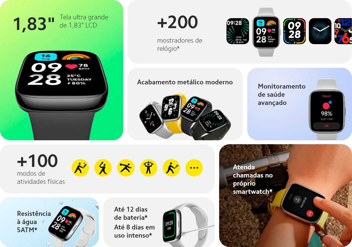 *Modo de uso intenso: Condições de teste de 8 dias para o Redmi Watch 3 Active: Carga completa, configuração padrão de fábrica, monitoramento de frequência cardíaca a cada 1 minuto, monitoramento de sono de alta precisão avançado, recebimento e exibição de 200 mensagens de notificação por dia, configuração de 4 alarmes por dia, levantar o pulso para acender a tela 200 vezes por dia, recebimento de 4 notificações de chamadas por dia, 30 minutos de chamadas Bluetooth por semana, 150 minutos de exercícios por semana e todas as outras configurações padrão.
